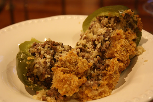 bell peppers stuffed with cauliflower "rice" and beef with almond flour crust